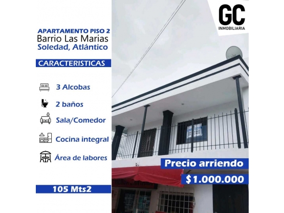 Se arrienda apartamento piso 2 ubicado en el barrio las marias - soledad que consta de 3 alcobas , 2 baños , sala / comedor , cocina integral y zona de labores ( Apartamento para uso residencial o comercial )