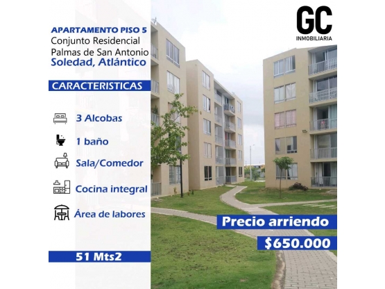 Se arrienda apartamento piso 5 ubicado en el conjunto residencial palmas de san Antonio que consta de 3 alcobas , 1 baño , sala / comedor , cocina integral, pisicina.