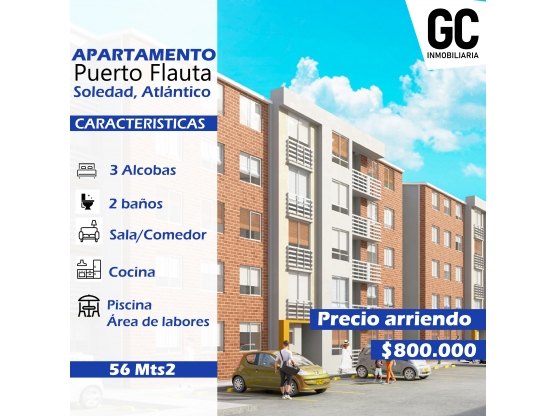 Se arrienda apartamento para estrenar ubicado en el Conjunto Puerto Flauta cuenta con un área de 56m² con una excelente distribución de espacios que incluye tres alcobas, sala comedor, cocina abierta, dos baños cada uno con su ducha, espacio disponible para que ajustes de acuerdo a tus necesidades y área de labores independiente.