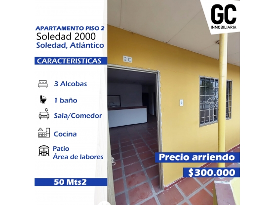Se arrienda sencillo apartamento 2 piso ubicado en soledad 2000 que consta de 3 alcobas, 1 baño , sala/comedor , area de labores y patio