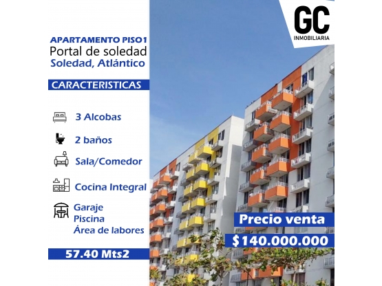 Se vende apartamento piso 1 en el conjunto portal de soledad que consta de 3 alcobas , 2 baños , sala / comedor , cocina inegral y area de labores.