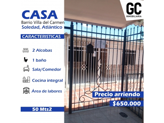 Se arrienda casa ubicada en el barrio villa del carmen que consta de 2 alcobas ( cada dormitorio tiene closet ) 1 baño , sala / comedor , cocina con muebles , rejas de seguridad .