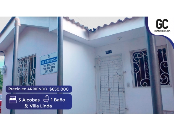 Se arrienda casa ubicada en villa linda, es una zona cerrada y cómoda, cuenta con parquedero comunitario, 3 habitaciones, 1 baño, sala, cocina, patio pequeño, cerca al inmueble se encuentra via principal, el centro comercial nuestra atlantico, la nevada cochofal, fácil acceso a transporte público.
