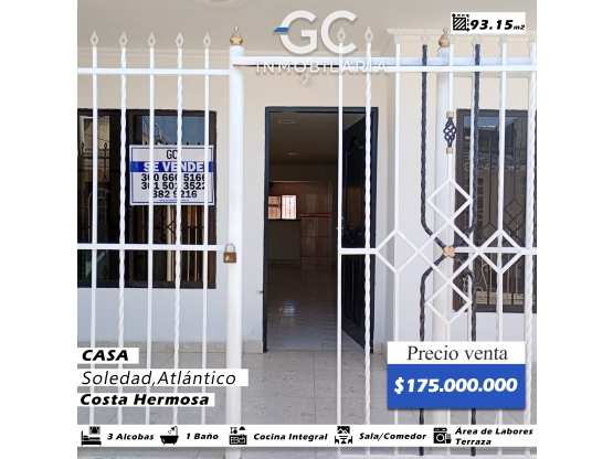 Se vende casa ubicada en costa hermosa - soledad,atlantico que consta con 3 alcobas , sala /comedor , 1 baño , terraza y su area de labores.