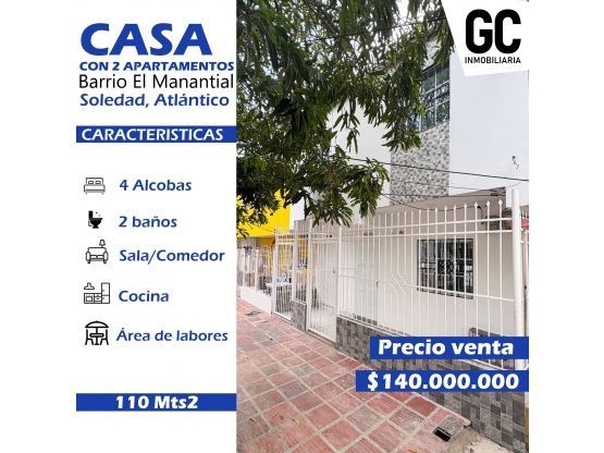 Se vende casa con 2 apartamentos ubicada en el barrio el manantial que consta en el (primer piso de 2 alcobas , 1 baño , sala / comedor , cocina ) y ( el segundo piso de 2 alcobas , 1 baño , sala / comedor , cocina ) con entrada independiente