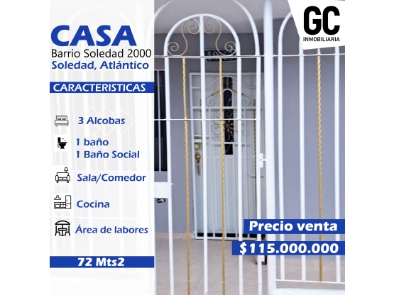 Te presento esta amplia y cómoda casa ubicada en el barrio Soledad, en el departamento del Atlántico. Con un área total de 72 M2, esta propiedad cuenta con una construcción de 67 M2 y una área privada de 72 M2, perfecta para brindar un espacio amplio y confortable para ti y tu familia.